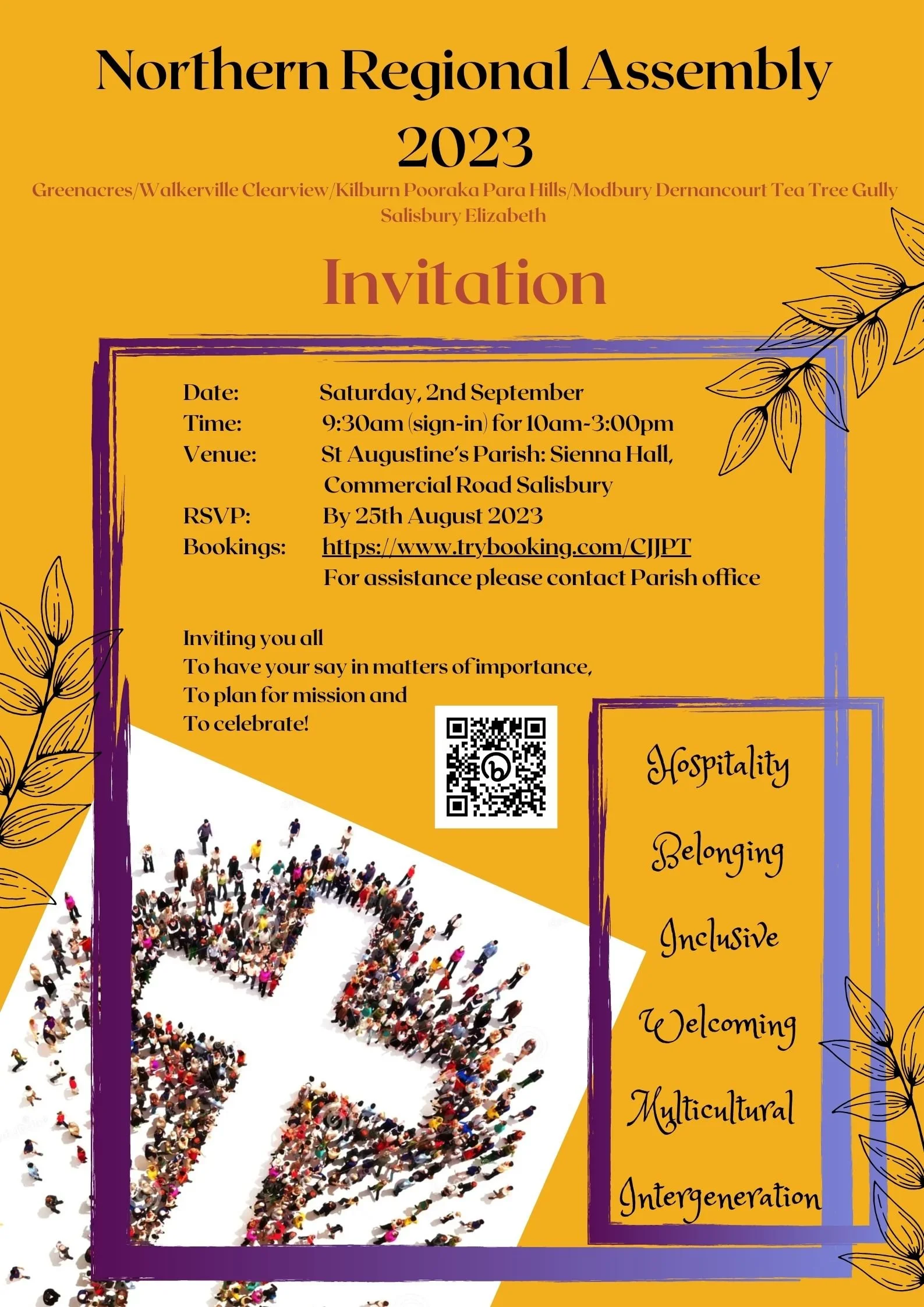 Northern Regional Assembly 2023 Greenacres/Walkerville, Clearview/Kilburn, Pooraka, Para Hills/Modbury, Dernancourt, Tea Tree Gully, Salisbury and Elizabeth parishes invite you to have your say on matters of importance, plan for mission and celebrate. Saturday September 2, 9.30am, St Augustine’s parish: Sienna Hall, Commercial Road Salisbury. RSVP August 25. Bookings: https://www.trybooking.com/CJJPT